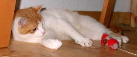 | Das war Muck. Er war ungemein furchtlos und tapfer und mutig, wenn kein anderer Kater in der Nähe ist. Obwohl er es rein physisch sicher mit jedem anderen in und ums Haus aufnehmen konnte, steckte ein Angsthase in Muck. Sehr gern lag er unter irgend einer Decke und macht sich unsichtbar. Meist hielt er sich tagsüber im Garten auf . Sehr häufig war er in "Katerwärmgruppen" mit Samson und Sunday zu finden. Neues, ihm Unbekanntes flößte ihm schnell panikartige Angst ein. Muck brauchte sehr viel Zuwendung und Nähe, was aber auf Grund seines imposanten Gewichts oft problematisch war. Am 28. Oktober 2008 ist er für immer eingeschlafen und ist zum Fuße der Regenbogenbrücke gezogen. |