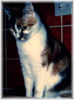| Das war Semiramis. Sie war bisher die Kleinste und Zurückhaltendste im Team. Seit dem 19.April 2001 schläft sie nun am Fuße der Regenbogenbrücke. Ihre schwere Erkrankung verschlimmerte sich so dramatisch, dass die schon sehr geschwächte "Mips" keine Chance zum Weiterleben hatte. Semiramis musste früher im Haus ständig auf der Hut vor ihren Jägern, den ach so lieben Mitkatzen, sein. Nicht, dass sie je dabei ernsthaft angegriffen oder gar verletzt worden sei, trotzdem machte diese oft sehr lautstarke Toberei offensichtlich nur ihren Peinigern Spaß. Nachdem sie dann aber den Garten kennengelernt hatte, fand man sie bis zum Beginn ihrer schweren Nierenerkrankung tags und nachts draußen. Auf Grund ihres steten Misstrauens grenzte sie sich meist von den anderen Katzen ab, war uns gegenüber aber seit Beginn ihrer schweren Erkrankung Ende'99 sehr anhänglich. |