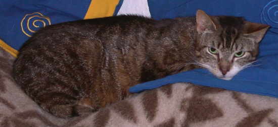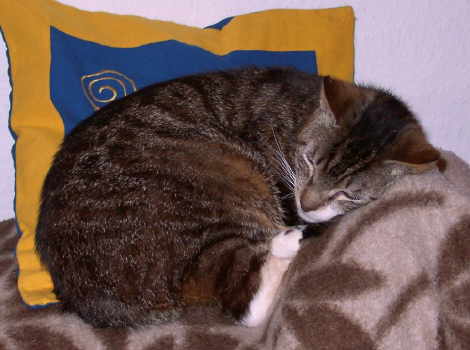 | Das war Samson. Er war sowas Ähnliches wie der Chef der "Meute" - oder besser gesagt, er bildete sich das ein. Samson war der sportlich-jugendliche Typ, der um nichts bittet oder bettelt, sondern Forderungen stellte. Verständlicherweise brachte ihm das häufig Ärger mit uns und seinen Mitkatzen ein. Stete Neugier und keine Angst vor Fremden, maximal angemessene Vorsicht, machten ihn aber dennoch sehr sympathisch. Ein böser Unfall im Sommer '99 kostete ihn mehr als die Hälfte seines Schwanzes. Samson war aber nicht nur neugierig, abenteuerlustig und vorwitzig. Nächtelang versetzte er uns im Sommer in Angst und Schrecken, weil er als Lebemann seine Nächte lieber draußen irgendwo verbrachte als mit seinen Kollegen zu Hause zu ruhen. Er konnte aber genauso gut schnurrend bei oder auf uns Platz nehmen - egal, ob wir gerade Zeit dazu haben oder nicht - und Streicheleinheiten einfordern, die er begeistert genoss. Anfang 2009, in seinem 14 Lebensjahr begann er deutlich abzumagern und seine Kräfte schwanden. Auch ärztliche Kunst konnte seinen Zustand nicht aufhalten oder verbessern. Am 11.03.2009 entschlief er sanft auf seinem Kissen und trat seine Reise zur Regenbogenbrücke an. |