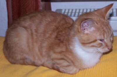 | Zusammen mit der kleinen Paula kam Fränzi am 23. Oktober 2003 zu uns. Bei ihren "Dosis" vor uns und in der Katzenpension, aus der wir sie abgeholt haben, waren beide unzertrennlich. Bei uns jedoch gingen sie von Anfang an auf eigene Faust auf Entdeckung. Fränzi war eine sehr schöne Katze, wobei rotgetigerte "Mädchen" ja sehr selten sind. Wir vermuten, dass unsere Fränzi eine Wildkatze war, d.h. sie hatte als kleine Katze keinen oder sehr wenig Kontakt zu Menschen. Deshalb war sie vielleicht so ungemein vorsichtig. Nur wenn es ums Futter ging und natürlich bei jedem Leckerbissen war jede Angst vergessen. Fränzi war in ihrer Vorsicht absolut bestechlich. Selbst ihr rostig klingendes Miau ließ sie in großer Futtererwartung erklingen. Wenn sie es jedoch für richtig empfand, konnte sich der rote "Tiger" auf intensives Schmusen und Schnurren einlassen. Völlig problemlos ist das Meistern der Katzenklappe vonstatten gegangen. Fränzi beherrschte sie ohne Training als hätte sie nie etwas anderes getan. Sie kam aber nach kurzen Ausflügen immer recht schnell wieder nach Hause. Für immer wird ihr Fenstersturz über das Glasvordach mit „Plopp-Quietsch-Bumm“ uns in Erinnerung bleiben. (Plopp aufs gläserne Vordach; Quietsch die Glasplatte herunter und Bumm ins weiche Gras vorm Haus) Dabei hat sie sich natürlich nicht mal weh getan. Für uns völlig ungeklärt, lag sie plötzlich tot vor unserem Haus. Somit ist sie am 06.08.07 für uns völlig unerwartet zur Regenbogenbrücke gezogen. Auch sie werden wir nie vergessen. |