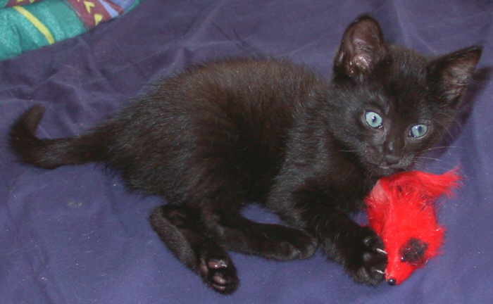 | Das war Mickey. Dieser kleine rastlose Wirbelwind kannte keine Gefahr. Nichts und niemand war flinker und stärker als Mickey - bis auf ein Auto... Seit dem 24.April 2001 schläft Mickey nun auch am Fuße der Regenbogenbrücke. Sie wurde nur 2 Jahre alt. Im August 1999 schaute eine winzig kleine, deshalb aber keineswegs ängstliche Katze unter dem Auto vorm Haus hervor. Auch diese Kleine konnten wir nicht unversorgt wieder ziehen lassen. Ergebnis: Die kleine Katze entschied sich für uns! Wegen ihrer damals etwas überdimensional erscheinenden Ohren bekam sie den Namen Mickey. Von Anfang an hat sie durch ihre stete Verspieltheit mit allen anderen Freundschaft geschlossen. Am liebsten balgte, tobte und spielte sie den ganzen Tag. Dabei machte das Jagen auf alles was sich bewegt und evtl. fangbare Beute ist, (Laubblätter, Schmetterlinge, Fliegen, Spitzmäuse, Vögel...) einen Riesenspaß. Wenn es jedoch ums Futter ging, war alles Spielen sofort vergessen. |